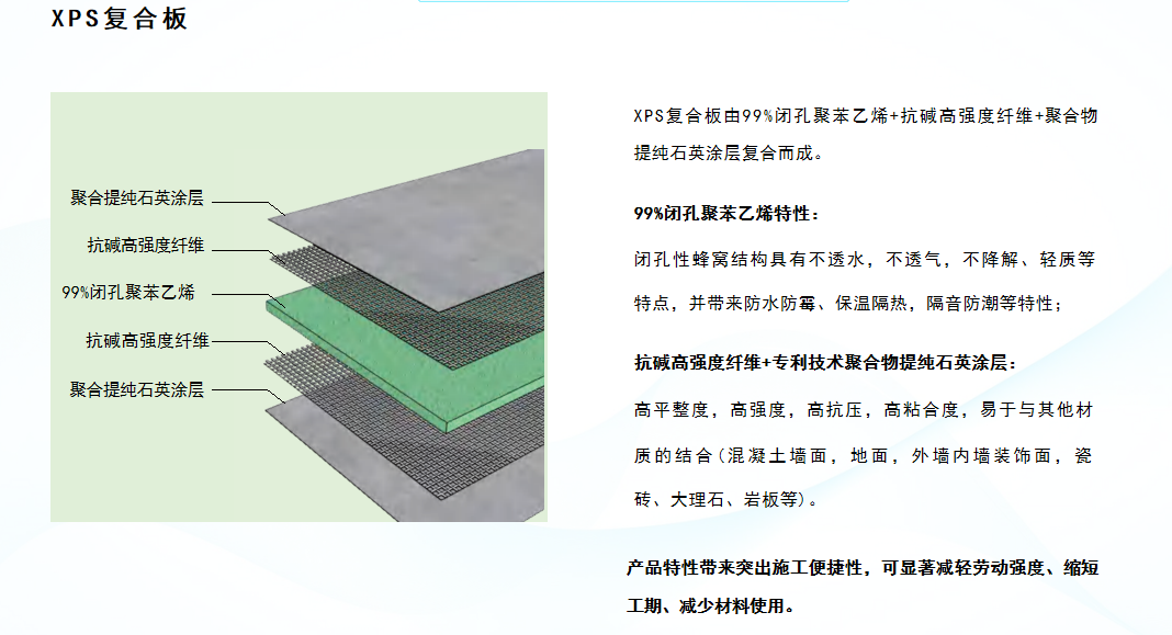XPS板的完全闭孔式发泡化学结构与其蜂窝状物理结构,使其具有轻质、高强度的特性,便于切割、运输,且不易破损、安装方便。