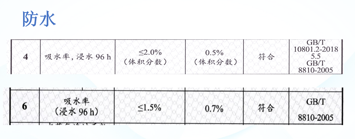 吸水率是衡量保温材料的一个重要参数。保温材料吸水后保温性能随之下降,在低温情况下,吸入的水极易结冰,破坏了保温材料的结构,从而使板材的抗压及保温性能下降。由于聚苯乙烯分子结构本身不吸水,板材分子结构稳定,无间隙,解决了其它材料漏水、渗透、结霜、冷凝等问题。